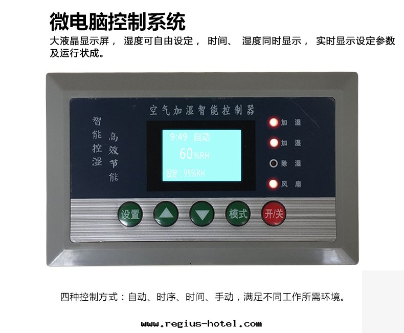 6、采用(yòng)大(dà)液晶顯示屏,湿(shī)度(dù)可(kě)自由(yóu)控制,並(bìng)同(tóng)时(shí)顯示环(huán)境湿(shī)度(dù)和(hé)設置时(shí)間(jiān)。