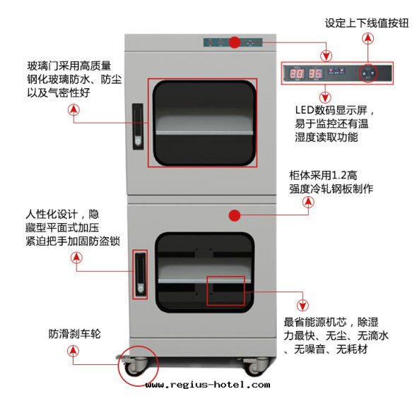 1、強(qiáng)力機(jī)芯:控湿(shī)強(qiáng),除湿(shī)快(kuài),最(zuì)低(dī)控制≤10%RH以(yǐ)下(xià)。