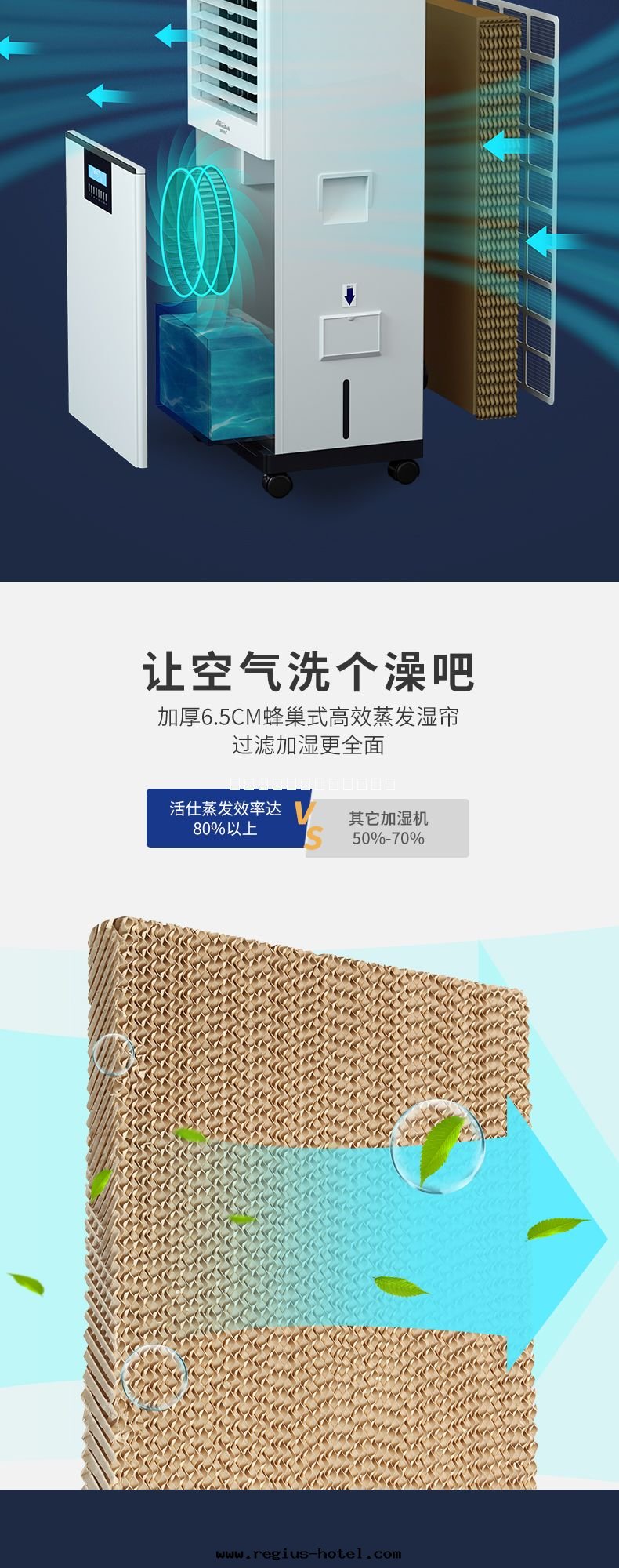 10、蜂巢式高(gāo)效蒸發(fà)膜蒸發(fà)效率高(gāo)达(dá)%80以(yǐ)上(shàng),吸水(shuǐ)性(xìng)好(hǎo),加湿(shī)效果好(hǎo),环(huán)保無毒耐黴抗菌,使用(yòng)壽命高(gāo)达(dá)5-8年(nián);